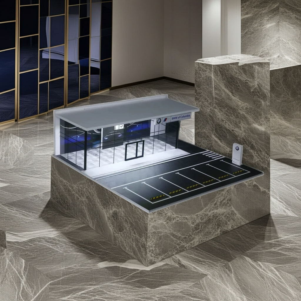 Avec son design tout en verre , ce showroom met parfaitement en valeur vos modèles BMW grâce à des angles de vue dynamiques et des détails architecturaux authentiques. Il vous permet d'exposer simultanément plusieurs voitures, des légendes de la course automobile aux icônes des supercars.