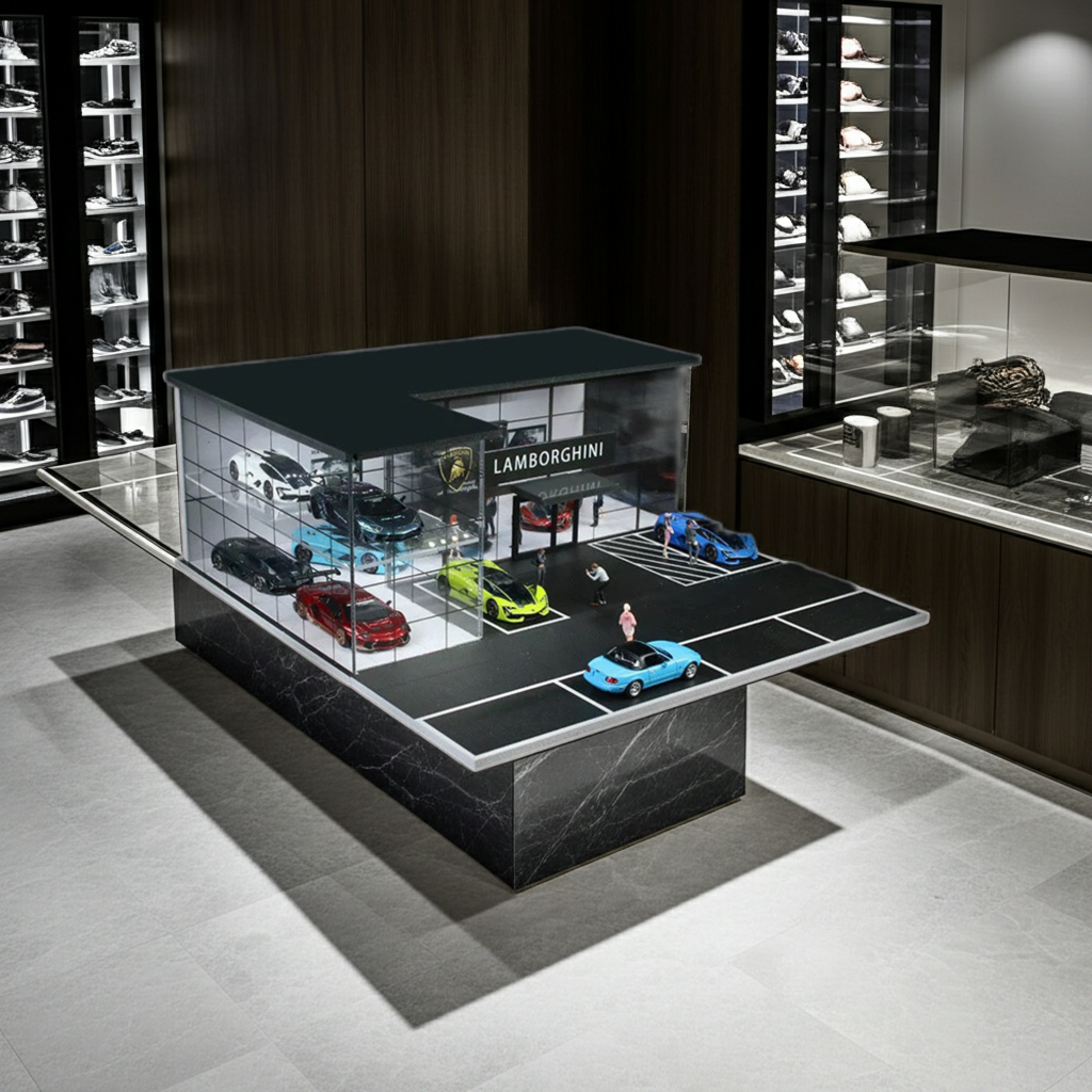Fabriqué à partir de panneaux en PVC de haute qualité et de parois en acrylique transparent, cet ensemble d'exposition modulaire est facile à assembler et conçu pour durer. Que vous recréiez une scène de concession automobile ou le garage de rêve d'un collectionneur, il constitue la pièce maîtresse idéale pour tout passionné de modèles réduits à l'échelle 1/64.