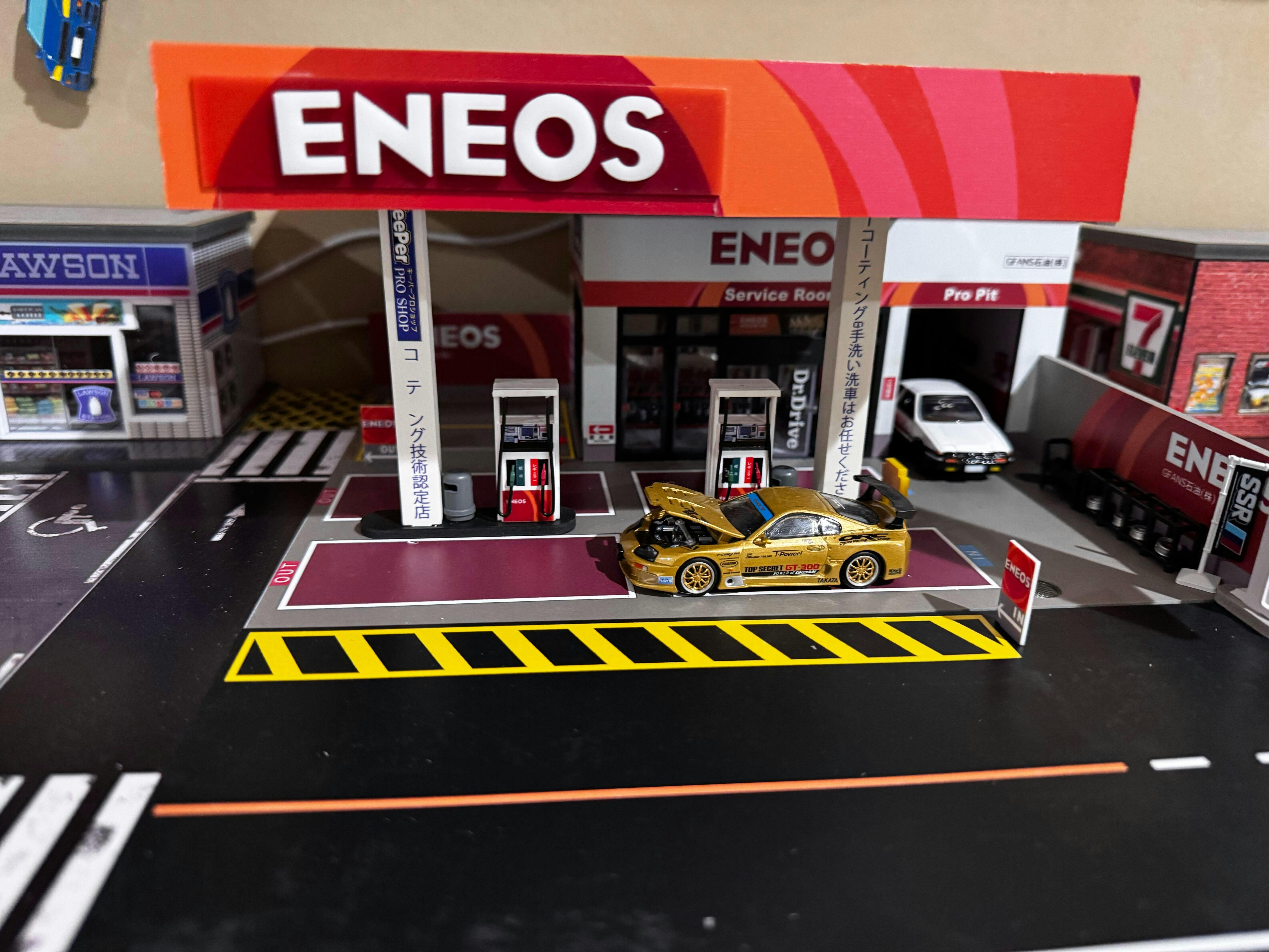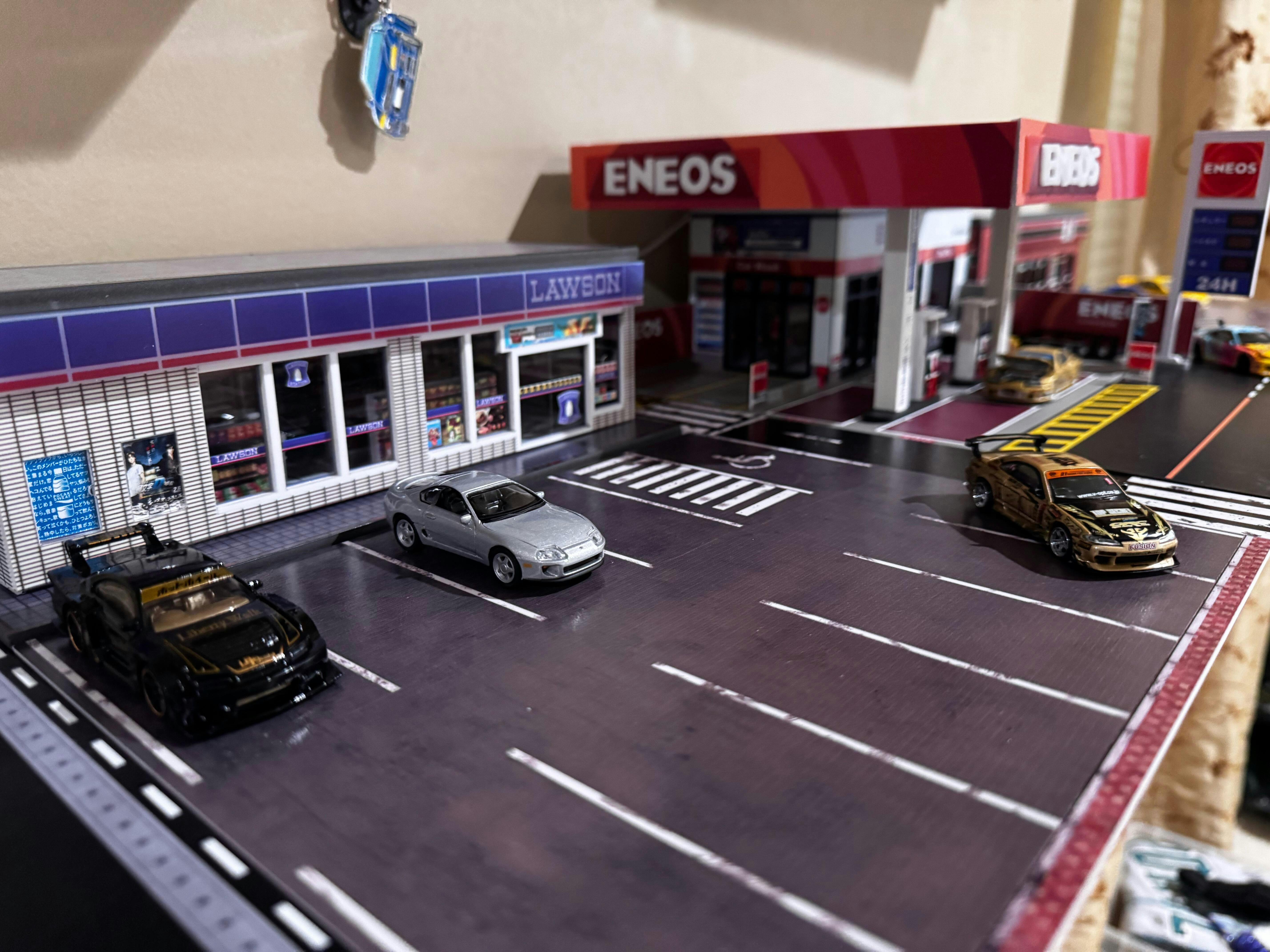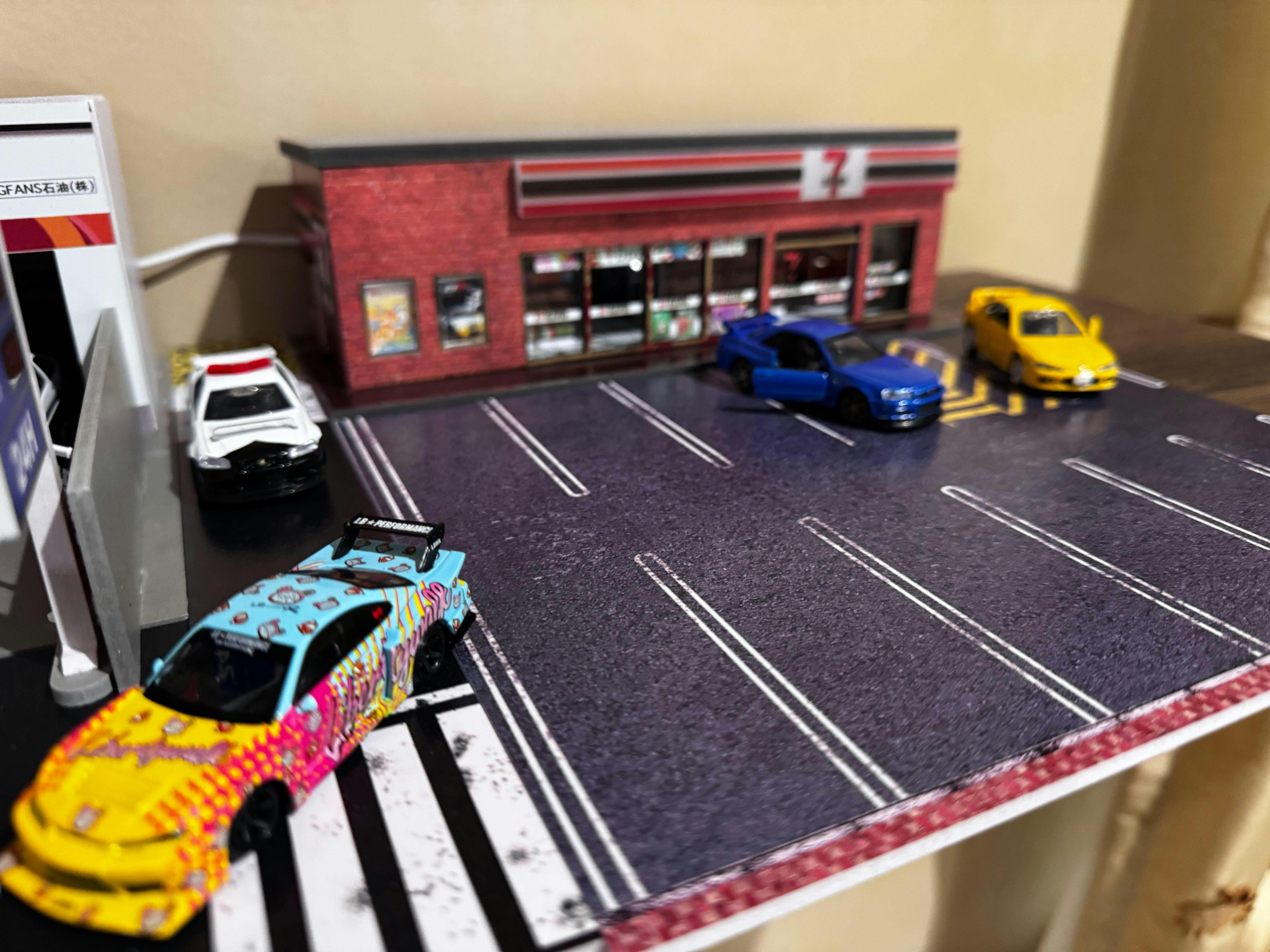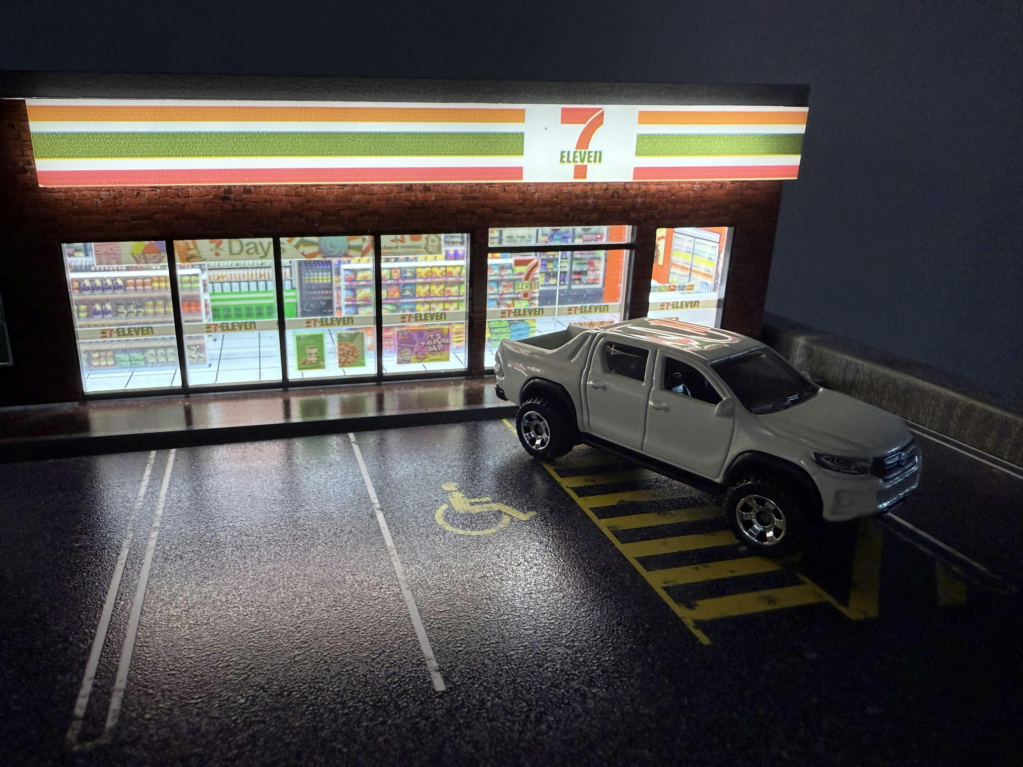 Eenmaal gemonteerd, brengt het via USB aangedreven LED-verlichtingssysteem de scène tot leven en verlicht het je auto's op schaal 1:64 in die onmiskenbare konbini-gloed.