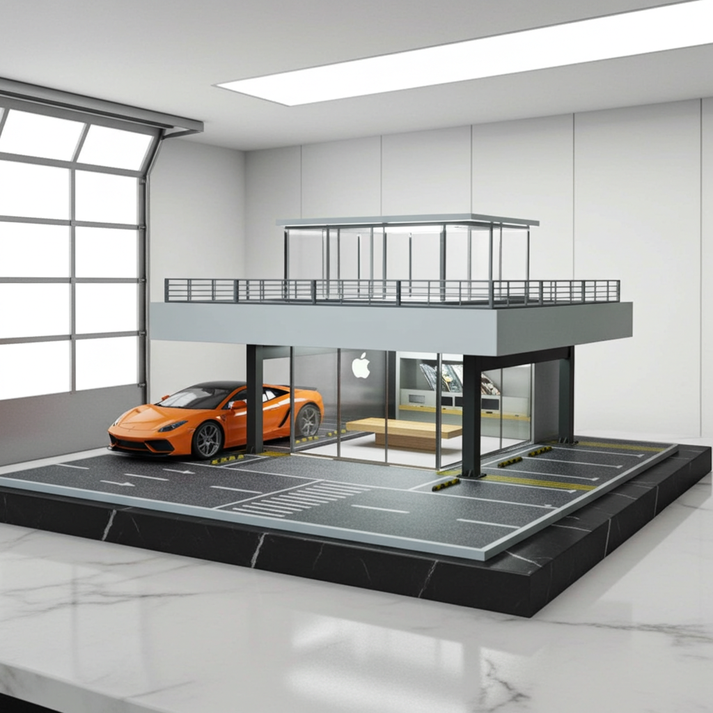 Deze Apple Store, met zijn glazen gevel over twee verdiepingen , is de perfecte plek om je 1:64 schaalmodellen te presenteren, met dynamische kijkhoeken en authentieke architectonische details. Op de boven- en benedenverdieping kun je meerdere auto's tegelijk tentoonstellen, van racelegendes tot iconische supercars.