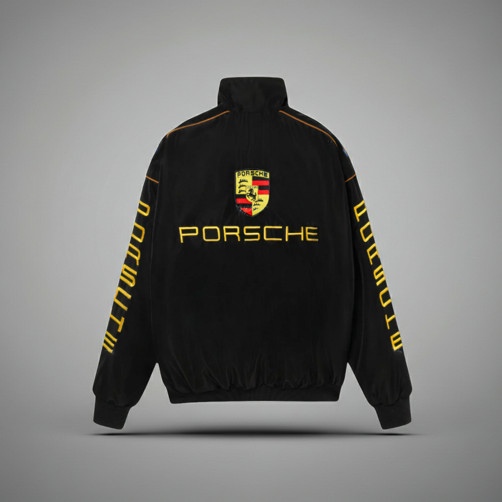 Hoogwaardig geborduurd Porsche -logo op de borst en mouwen.
