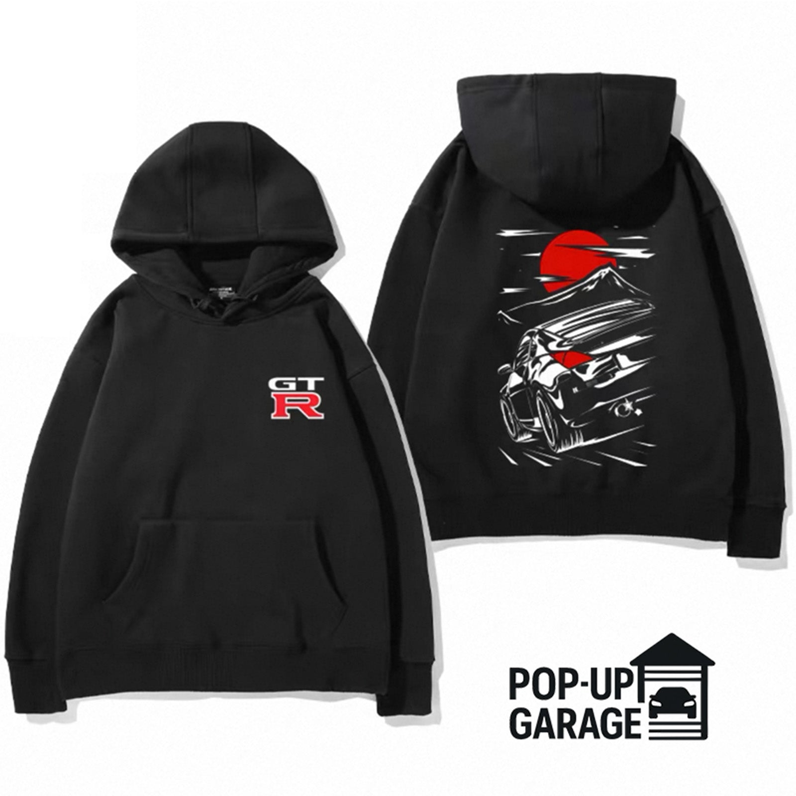 The back design features a sleek line-art illustration of the GT-R in full drift, set against a bold red sun and mountain backdrop — capturing the motion, energy, and heritage of JDM culture in one clean graphic. The GT-R chest logo adds the perfect finishing touch for an authentic look.