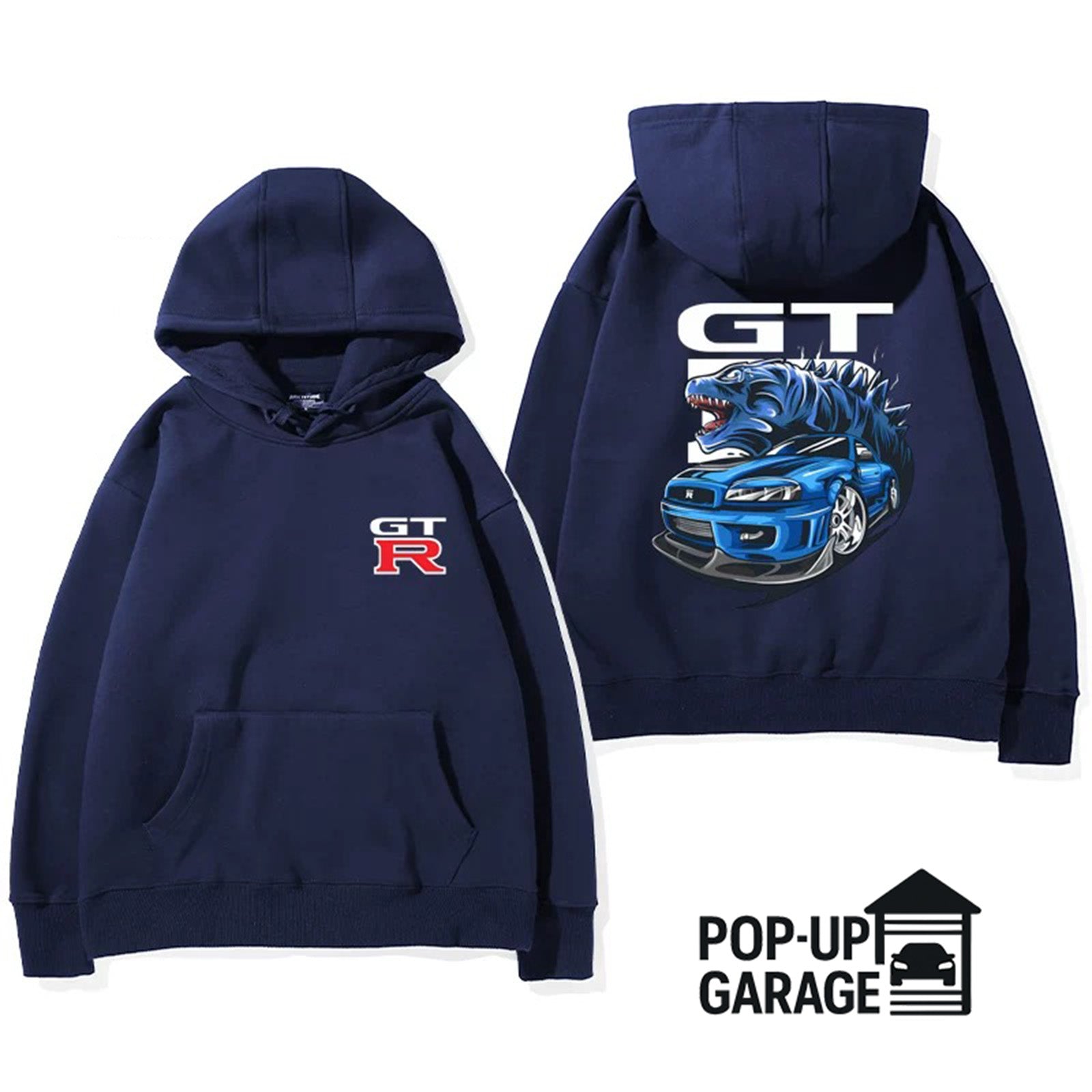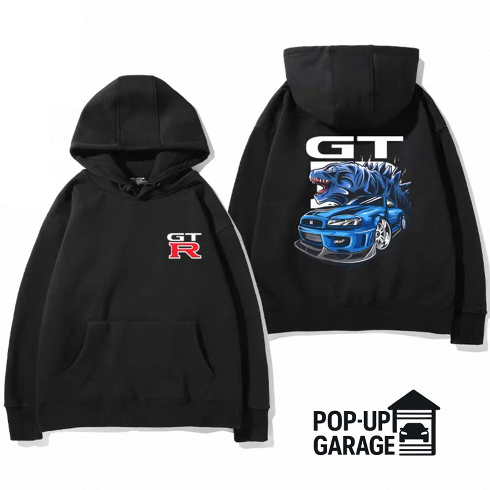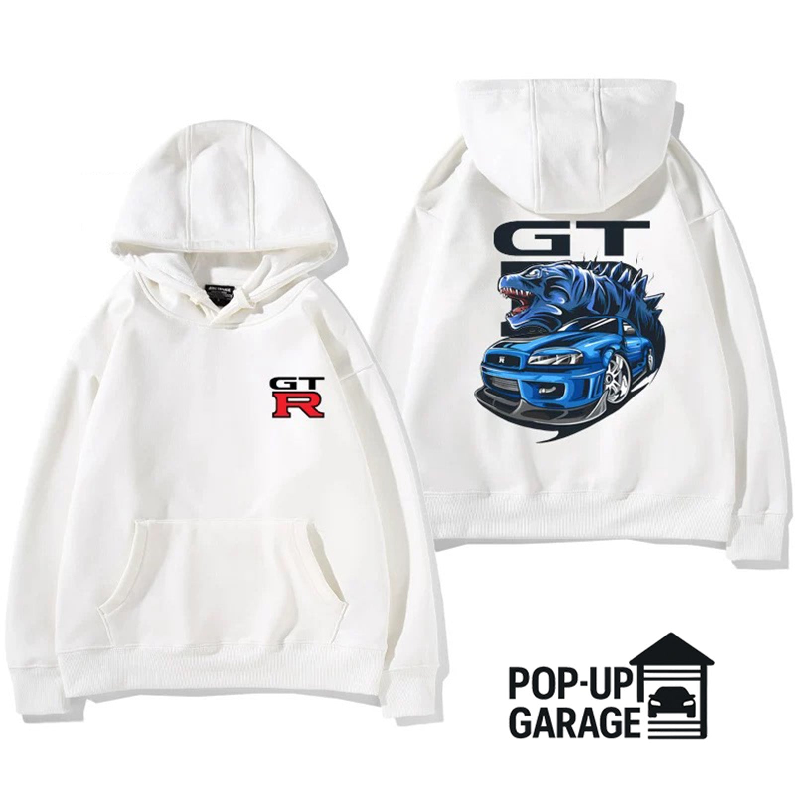 Featuring a striking back print of a roaring blue R34 GT-R morphing with Godzilla himself, this hoodie captures the unstoppable force and attitude that made the GT-R a global icon. The GT-R chest logo adds a clean, authentic touch to balance the bold back design.