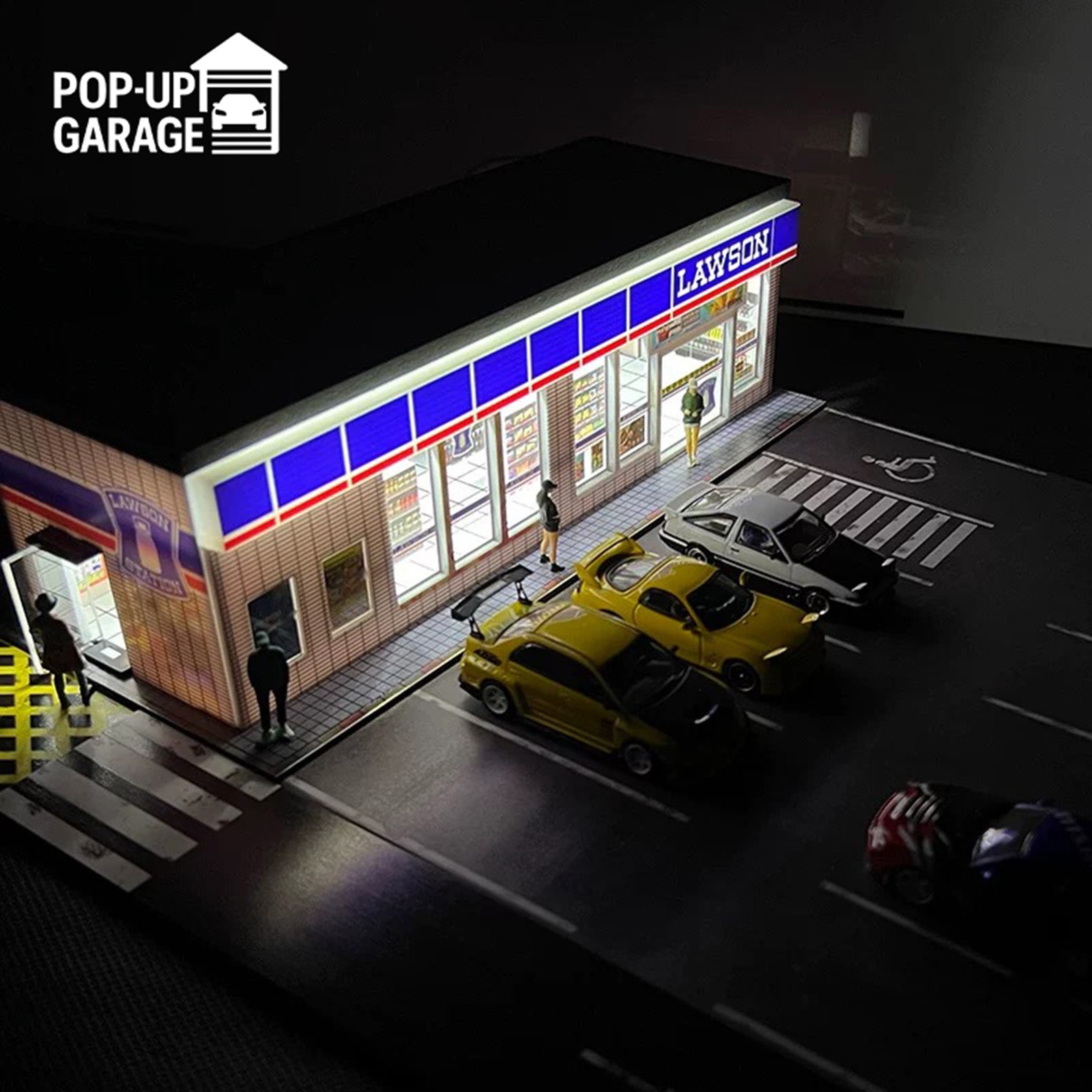 Once assembled, the USB-powered LED lighting system brings the scene to life — illuminating your 1:64 cars in that unmistakable konbini glow.