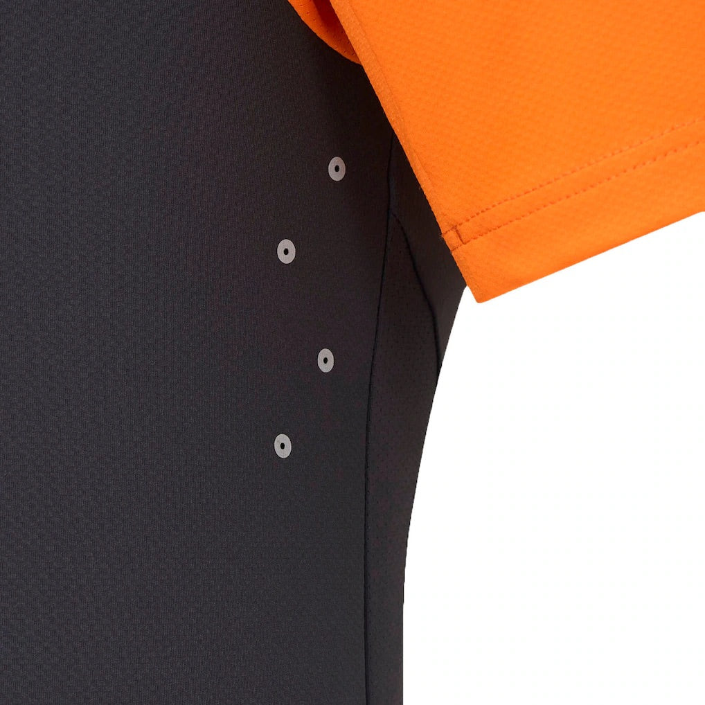 Meanwhile, the classic fit garment's lower-back mesh panel and laser-cut underarm ventilation establish greater airflow when dealing with intense moments.