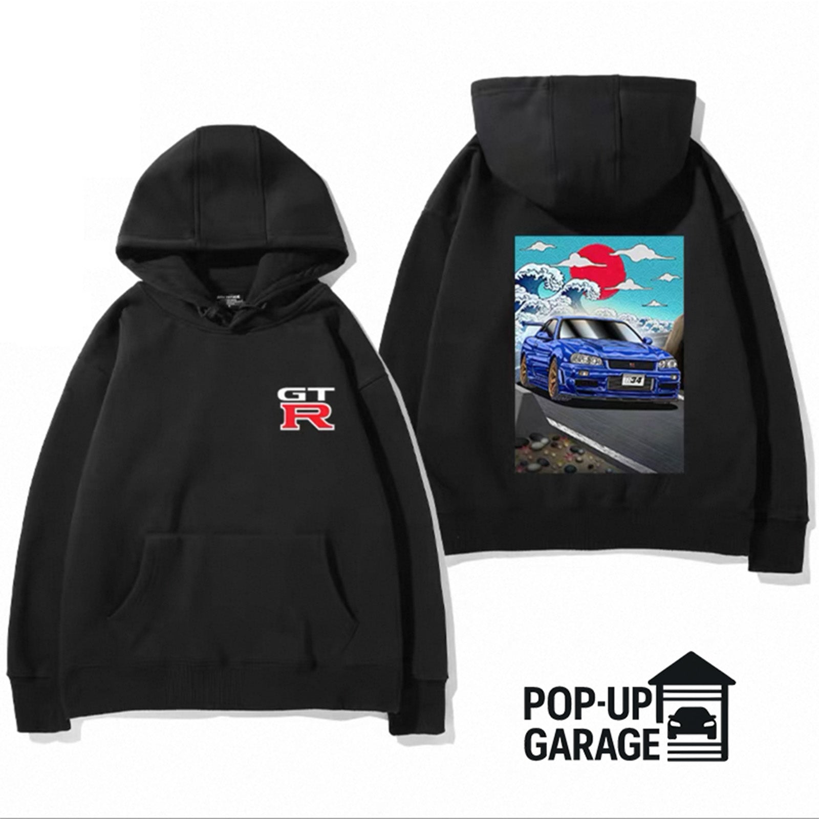 Featuring a vibrant back print of the iconic R34 GT-R against a stylized Great Wave backdrop and rising sun, this hoodie captures the spirit of motion, craftsmanship, and street legend status. The GT-R chest logo adds an authentic finishing touch, making it a must-have for collectors and enthusiasts alike.